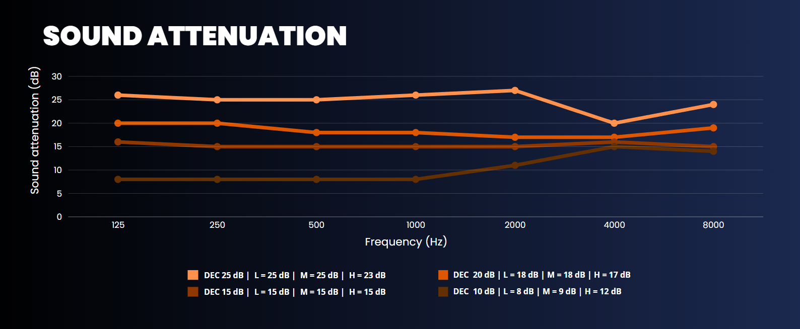 Vores formstøbte høreværn fås med 5 forskellige støjfiltre. Støjfilterene dæmper støjen ens over alle frekvenser hvilket gør dem velegnede til brugere med et stort tale og kommunikationsbehov.