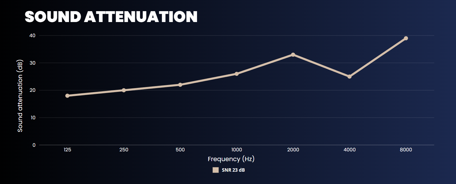 La protección auditiva viene con un filtro de ruido de 23 dB, que atenúa de forma no lineal, donde los sonidos de alta frecuencia, como el ruido del viento, son los que más se atenúan, mientras que los sonidos de frecuencia media y baja, como el habla y el motor, son los que menos se atenúan.
